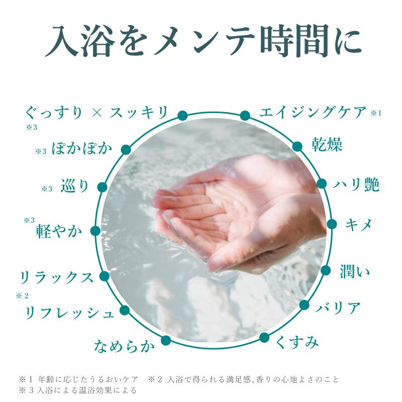 お湯に溶け込むことで、湯ざわりがやわらかくなり、入浴後はしっとりなめらかに。